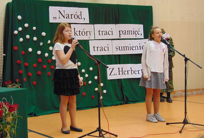 Już po raz kolejny w ramach obchodów rocznicy odzyskania przez Polskę niepodległości zaprosiliśmy do nas reprezentantów ze szkół podstawowych z Gminy Długołęka, by uświetnili swoją obecnością VIII Gminny Przegląd Pieśni, Piosenki i Poezji Patriotycznej. Spotkanie to było dla nas niezwykłą lekcją historii, gdyż w słowach i nutach pieśni patriotycznych zaklęta jest opowieść o naszej ojczyźnie. W tej słowno - muzycznej opowieści uchwycone zostały dni szczęśliwe i spokojne, ale także pełne grozy, lęku, strachu, trudnej walki.