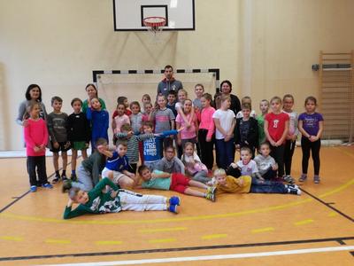 W środę 30 października uczniowie klas I-III mieli możliwość uczestniczenia w wyjątkowym wydarzeniu, jakim było spotkanie z mistrzem olimpijskim, wielokrotnym medalistą – p. Rafałem Omelko. Spotkanie odbyło się w ramach „Lekcji z Mistrzem” w związku z programem „Sprawny Dolnoślązaczek”, w której uczestniczą młodsi uczniowie naszej szkoły. Zajęcia odbyły się na sali gimnastycznej, uczniowie z wielkim zaangażowaniem uczestniczyli w zawodach, dzieci m.in. biegały drużynowo, skakały przez płotki. Na koniec zajęć sportowiec pokazał uczniom własne trofea i medale a także odpowiadał na wszystkie - nawet najbardziej wymagające pytania dzieci