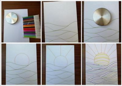 Trzeba etapami zrobić kompozycję zachodu słońca. Potem poliniować poszczególnie elementy. A na koniec uzupełnić wzorkami.
