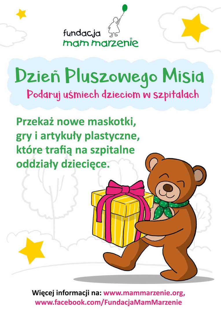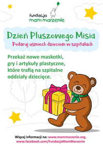 Fundacja Mam Marzenie, organizacja pożytku publicznego, która nieprzerwanie od 2003 roku spełnia marzenia dzieci w wieku od 3 do 18 lat cierpiących na choroby zagrażające życiu, już po raz dziewiąty organizuje akcję Dzień Pluszowego Misia i serdecznie zaprasza Państwa do udziału w niej.