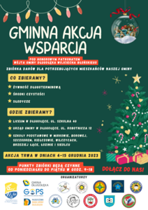 "GMINNA AKCJA WSPARCIA" KOLEJNA OKAZJA, ABY W CZASIE OCZEKIWANIA NA BOŻE NARODZENIE ZROBIĆ TAKŻE COŚ DLA INNYCH! Zapraszamy do udziału w "GMINNEJ AKCJI WSPARCIA" W ramach akcji zbieramy (tylko i wyłącznie): - żywność długoterminową - środki czystości - i słodycze Trafią do 80 potrzebujących rodzin z terenu gminy Długołęka, wskazanych przez Gminny Ośrodek Pomocy Społecznej Dary można składać na korytarzy przy wejściu do szkoły. do czwartku 14 grudnia (włącznie). Zdjęcia Zobacz również II Olimpiada Gier Historycznych Wspólnie wypracowaliśmy rekord kasztankowy! Charytatywny Dzień Życzliwości i Pozdrowień oraz... "GMINNA AKCJA WSPARCIA" Wyniki konkursu pt. "Mój kochany Miś": Szkolne WALENTYNKI połączone z KONCERTEM ŻYCZEŃ!... 11 grudnia 2023 Aktualności Wydrukuj Udostępnij Wyświetlono: 140
