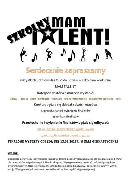 26 kwietnia 2016 Archiwum Szkolny "Mam talent!" SERDECZNIE ZAPRASZAMY!!! Wszystkich uczniów klas O-VI do udziału w szkolnym konkursie MAM TALENT Kategorie w których możecie wystąpić: śpiew -- taniec – sport i akrobacja... Czytaj więcej