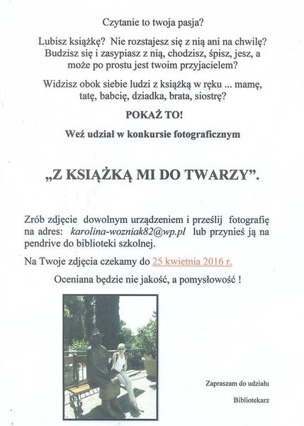 19 kwietnia 2016 Archiwum Konkurs "Z książką mi do twarzy" Zapraszamy do wzięcia udziału w konkursie! Szczegóły na plakacie. Czytaj więcej
